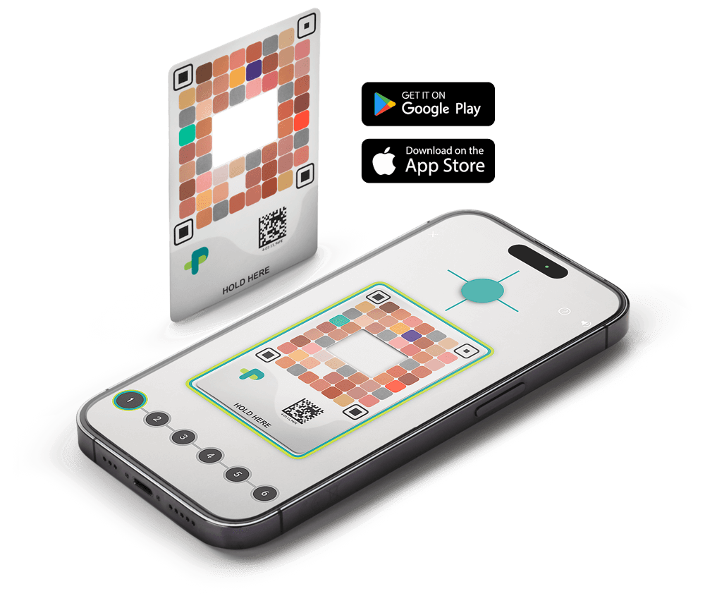 The image below is an example of what Picterus AS receives when scans are made. The background of the image is blacked out, only the Picterus® Calibration Card and the imaging window are retained. As shown in the sample below, the app only processes anonymous calibration data for functionality. Personal photos are not retained.